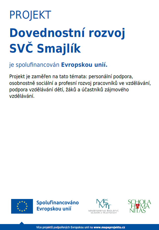 SVČ Smajlík realizuje od 1. 1. 2025 projekt “Dovednostní rozvoj SVČ Smajlík”, který je je spolufinancován Evropskou unií.